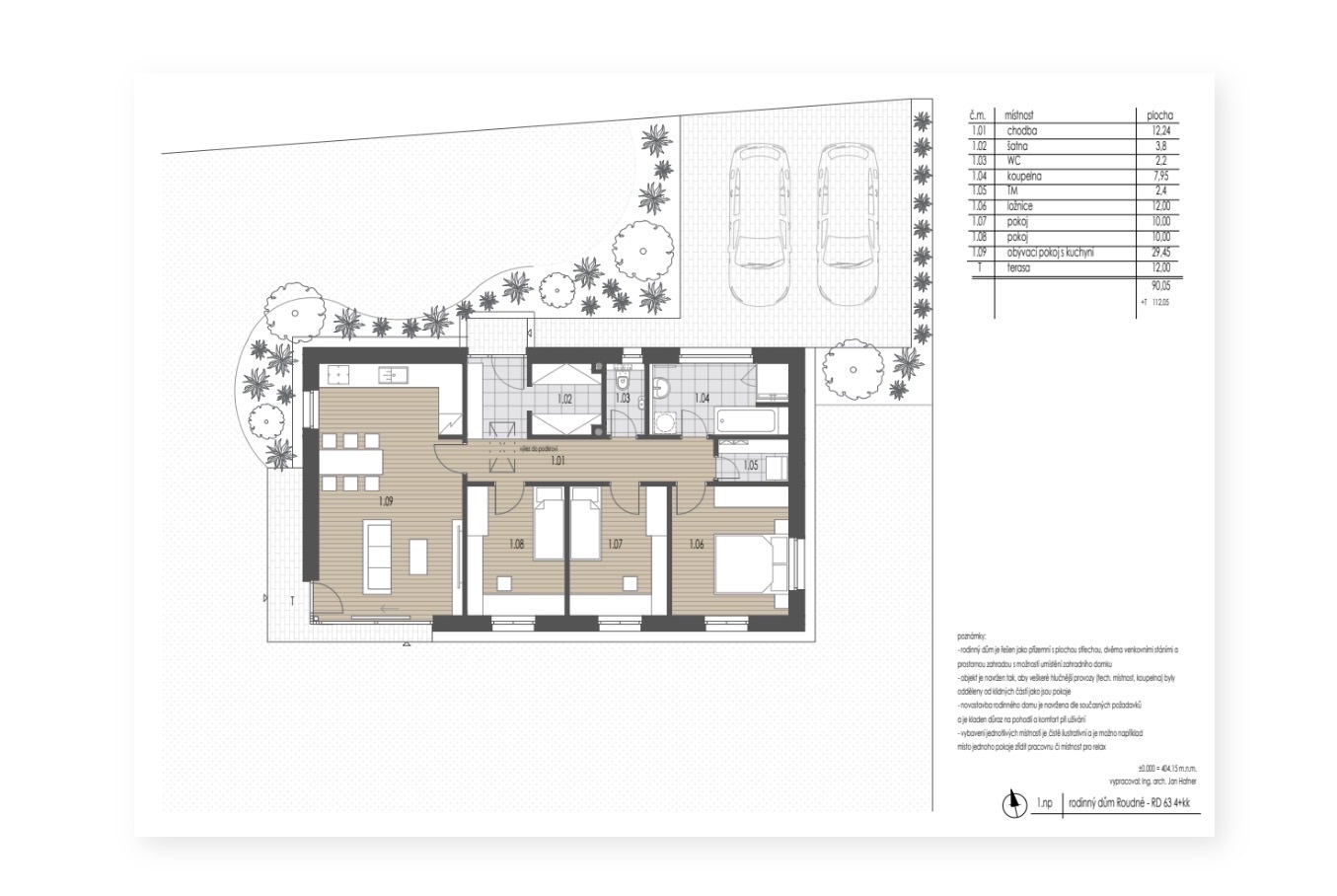 Obytná plocha domu je 90,05m2. Zastavěná plocha domu 112,50m2 + parkovací