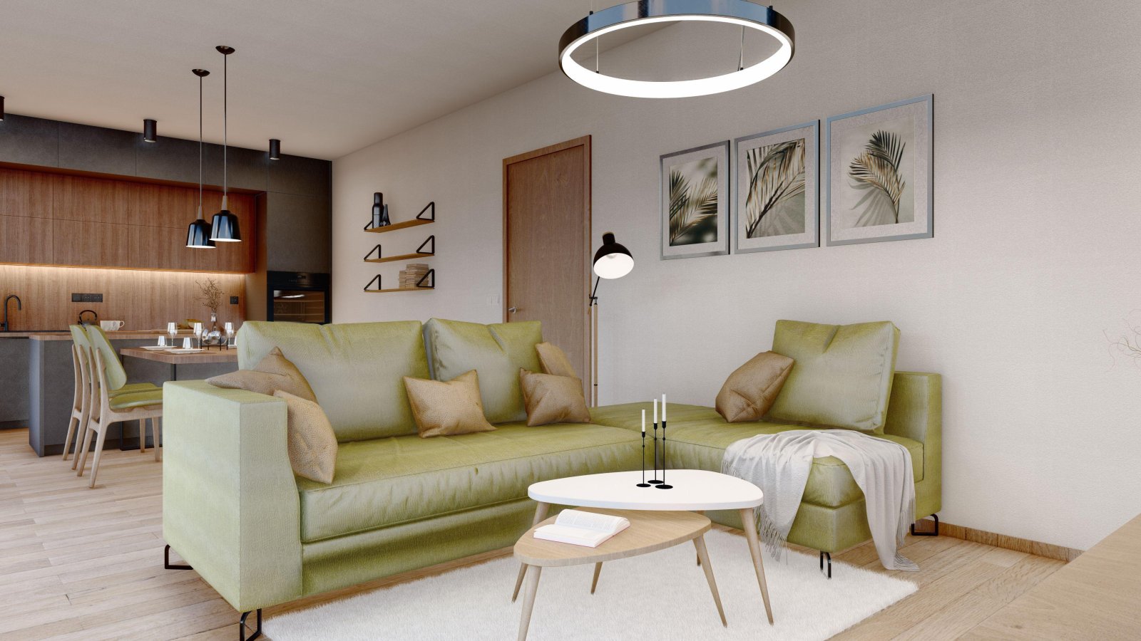 obývací pokoj s kuchyňským koutem (21,98m2), z obýváku je vstup na