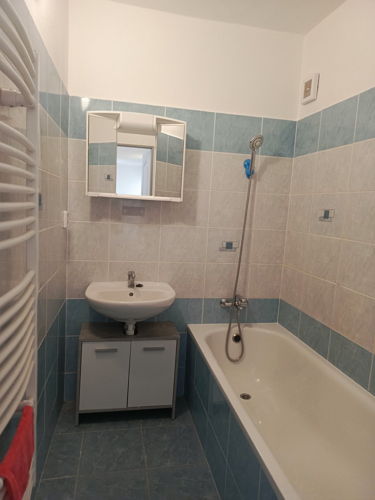 rekonstrukci a nabízí vanu, umyvadlo se skříňkou a zrcadlo. Součástí