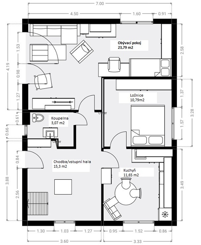 Měsíční náklady na provoz domu činí přibližně 6.500 Kč. Některé