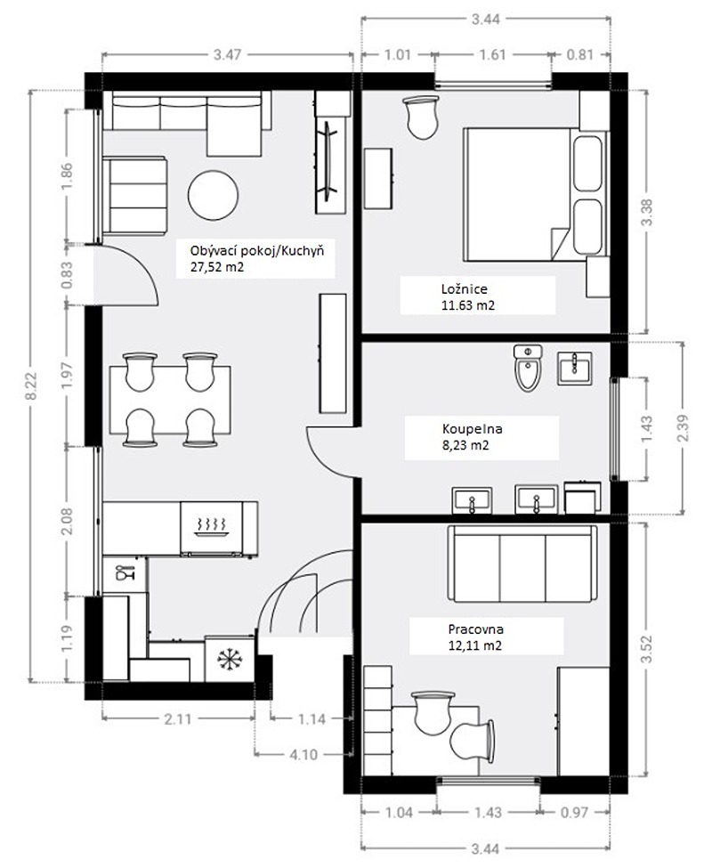 V 1.NP je bytová jednotka o dispozici 2+1, v 2.NP se nachází byt 3+kk. Oba