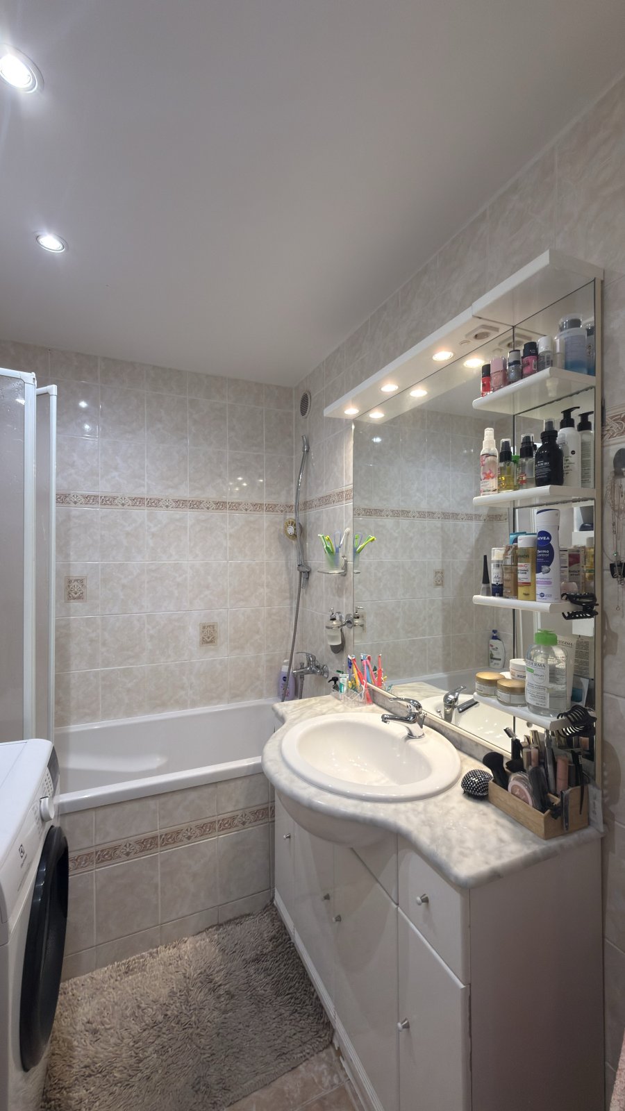 Byt prošel rekonstrukcí — umakartové jádro je vkusně obloženo, koupelna